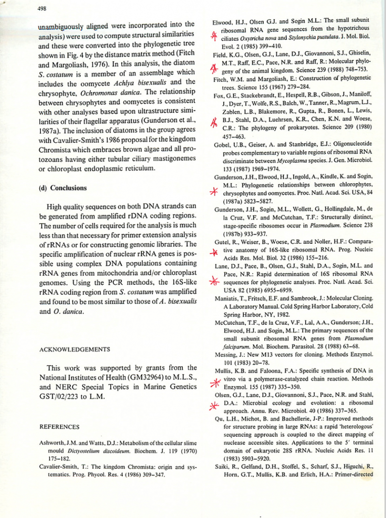 So here is one for today – notes from a few talks by Mitch Sogin. Mitch had a big influence on me since I learned a lot about rRNA gene sequencing and PCR from him both directly and indirectly when I was an undergraduate researcher in Colleen Cavanaugh’s lab. For example, I read and re-read the Medlin et al. paper of his and even carried that paper with me until, well, today. I just found it in a folder where I found notes from some of Mitch’s talks.